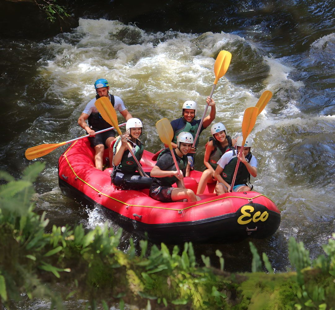 O rafting é uma experiência que mistura aventura, diversão e contato direto com a natureza. O percurso tem 5 km de descida pelas corredeiras, repleto de momentos únicos.